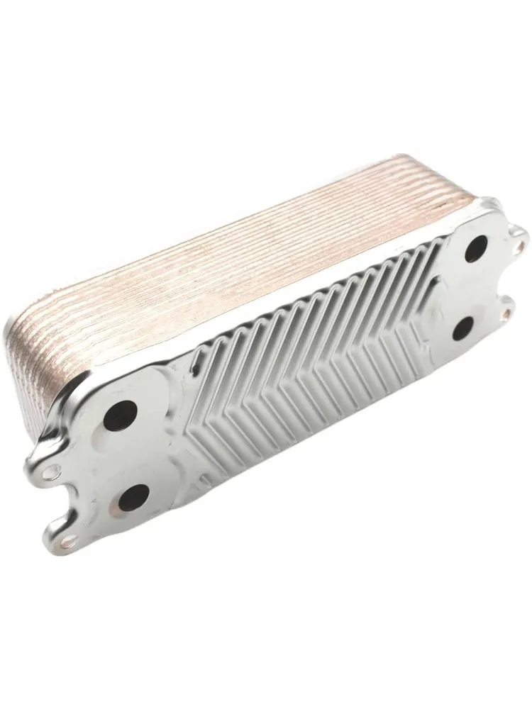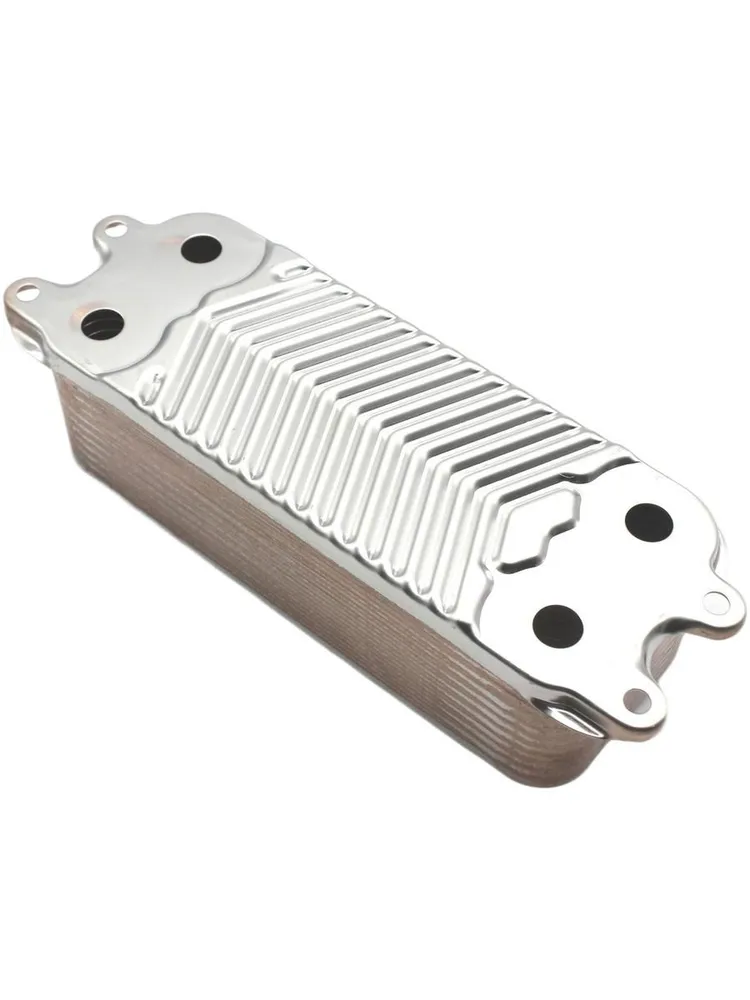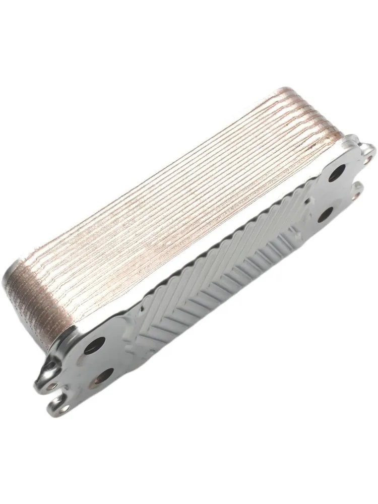 20 plakalı yapısı sayesinde daha geniş ısı transfer yüzeyi sunar. Özellikle yoğun sıcak su kullanımında daha dengeli ve güçlü performans sağlar. Kulaklı montaj yapısı, kombi içerisindeki bağlantı noktasına uyumlu şekilde tasarlanmıştır.