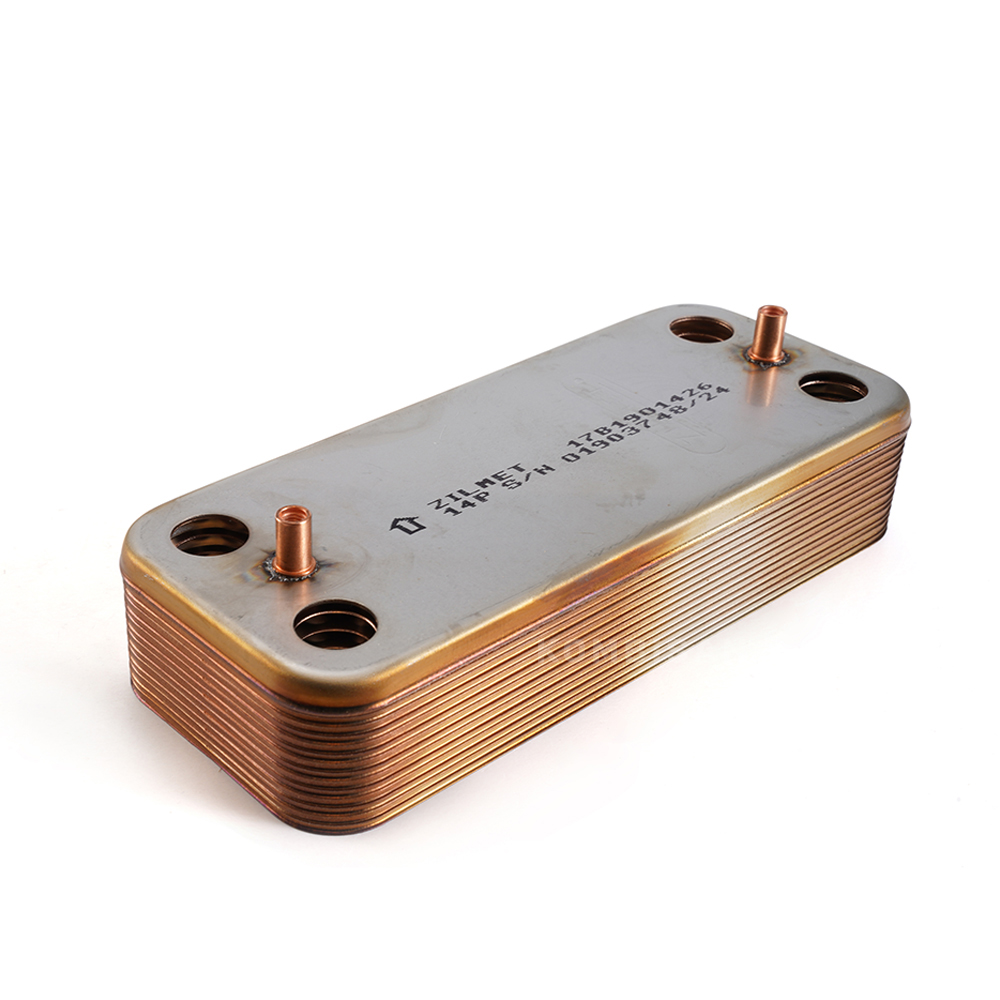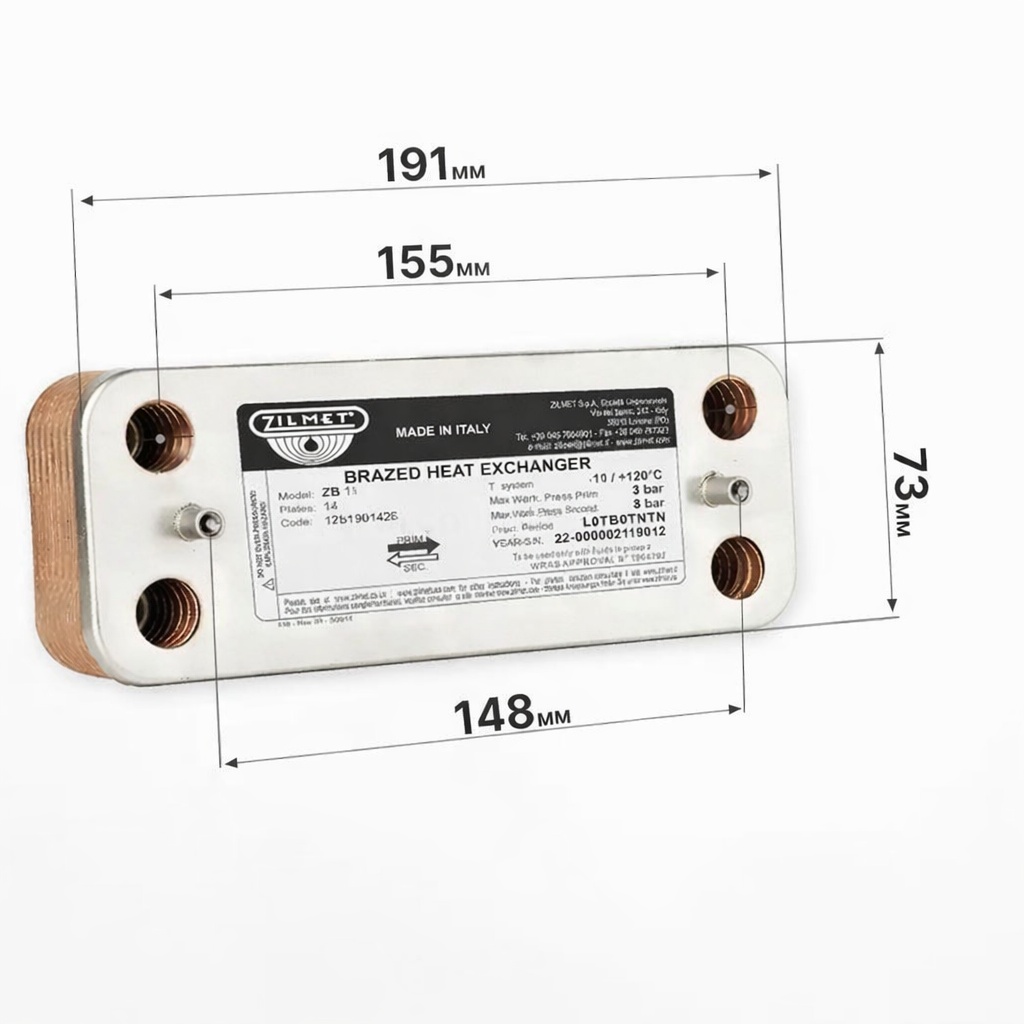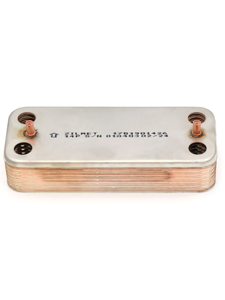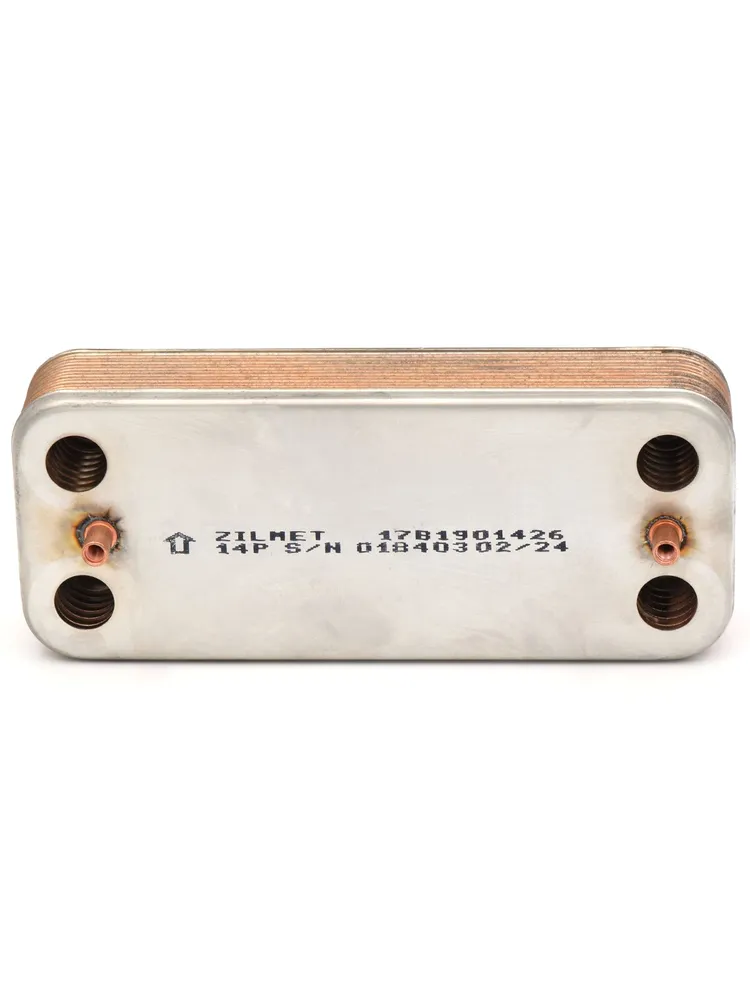 Zilmet 148 mm 14 plakalı eşanjör, kombilerde sıcak su üretimini sağlayan plaka tipi ısı değiştiricidir. Kalorifer devresindeki sıcak su ile kullanım suyu birbirine karışmadan, plakalar üzerinden ısı transferi yapar.