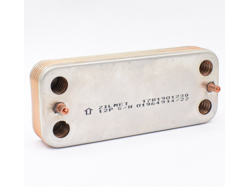 Airfel Eco5 kombi modelleri ile uyumlu 160 mm 12 plakalı Zilmet plaka eşanjör, kullanım suyunun hızlı ve dengeli şekilde ısınmasını sağlayan ısı transfer parçasıdır. Kalorifer devresindeki sıcak su ile şebeke suyu birbirine karışmadan plakalar üzerinden ısı aktarımı yapılır.